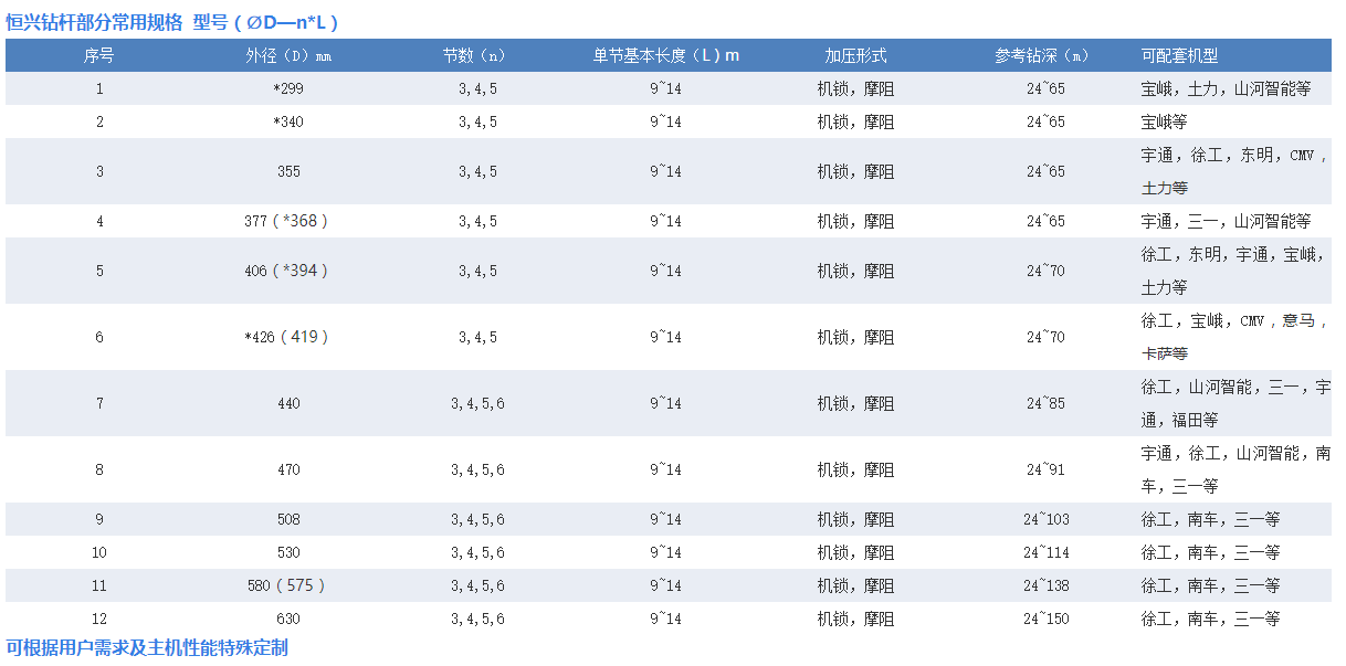6.鉆桿有摩阻式、機鎖式和組合形式,長度根據用戶實際需求并結合鉆機參數確定。不同的扭矩可以與大小、噸位不同的旋挖鉆機匹配,外徑系列和扭矩系列可以任意組合,吊耳和方頭有多重鏈接方式可共客戶選擇
